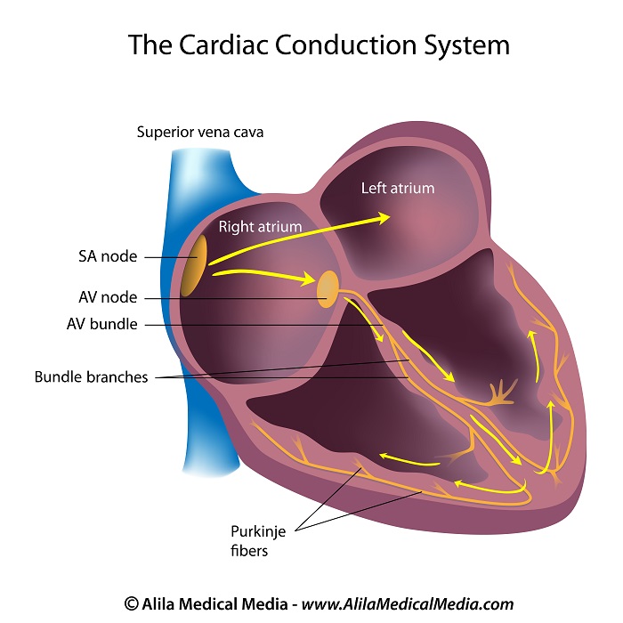The heart electrical signals are initiated in its natural pacemaker - the sinoatrial node, or SA node, and travel through the atria to reach the atrioventricular node, or AV node. The AV node is the gateway to the ventricles. The AV node passes the signals onto the bundle of His. This bundle is then divided into left and right bundle branches which conduct the impulses toward the apex of the heart. The signals are then passed onto fascicular branches, and spread through millions of Purkinje fibers over the ventricular myocardium.